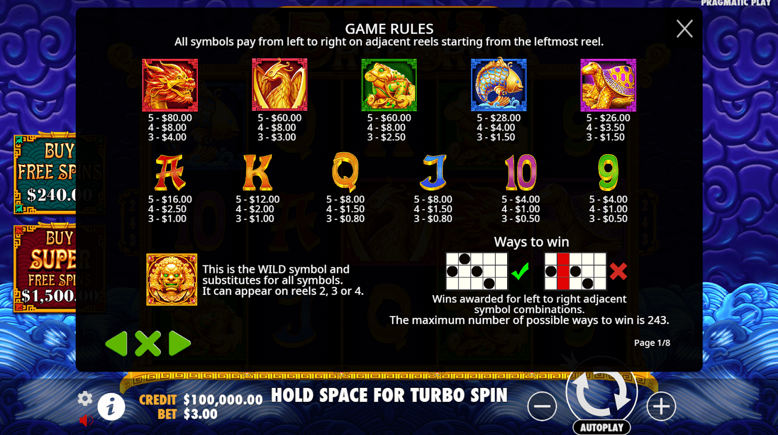 5 Lions Reborn, ontwikkeld door Pragmatisch spel, is een boeiend slot met hoge volatiliteit dat spelers uitnodigt naar een mythische jadetempel vol gouden beesten. Het draait op een raster van 5 × 3 met 243 manieren om te winnen, een royale RTP van 96,50% en inzetten van €0,30 tot €240. Turbo en 1-1 000 autospins houden het tempo hoog, terwijl een Feature Buy (80 × voor standaard gratis spins of 500 × voor Super Free Spins) voor onmiddellijke adrenaline zorgt. De spanning in het basisspel is te danken aan gestapelde premies en drakenwilds met willekeurige multipliers van 2-35 ×.