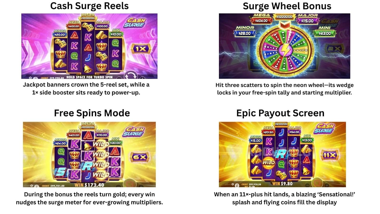 Cash Surge, gemaakt door Pragmatisch spel, combineert klassieke progressieve rollen met moderne bliksemmechanica op een 3-4-5-4-3 diamantraster dat 720 paden in beide richtingen biedt. Het heeft een RTP van 96,52% met een hoge volatiliteit en zet in van €0,20 tot €240. Er staan vijf progressieve geldprijzen boven de rollen, die bij bliksemsymbolen met 0,5 × de inzet stijgen. Lightning kan ook een bonuswiel laten draaien dat onmiddellijk de gekoppelde prijs toekent. Zonder ante-inzet of Feature Buy draait de strategie om het koesteren van die rolprijzen voordat er gratis spins worden geactiveerd.
